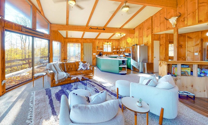 Showcasing mid-century modern charm, this three-bedroom escape comes thoughtfully appointed for family-friendly comfort and convenience. Make the most of the outdoors on the expansive wraparound deck, furnished with a gas grill and seating for alfresco meals, or gather around the wood-burning firepit for s'mores and starlight conversation. The bright, open living area features high ceilings and wall-to-wall windows offering panoramic views of the property. Relax around the living room fireplace or bust out the board games for some family fun in the four-seater game nook. The downstairs living area comes furnished for happy hour entertainment with a smart TV, a sofa lounge beside a pellet stove, and bar seating. Ground-floor entry, a bench, and a storage area with coat and gear racks adds convenience. Satisfy hungry appetites in the full kitchen equipped with everything you need for easy home cooking, including a dishwasher for stress-free cleanup.