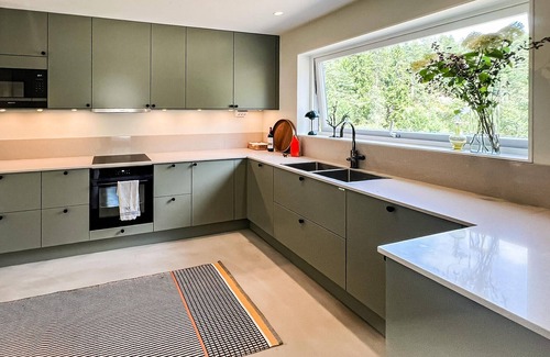 Comfort and cosiness are harmoniously combined in this wood-clad house. Floor-to-ceiling windows let in plenty of natural light, while warm wood and a cosy sofa invite you to linger. Whether you are listening to your favourite music or a podcast, reading or preparing delicious meals together in the modern kitchen, here you can organise your day entirely at your own pace.
