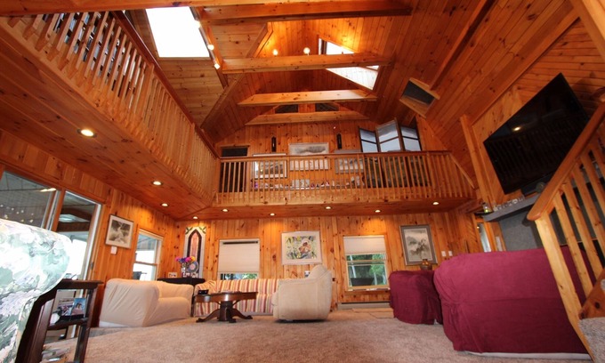 Upstairs there are 6 bedrooms, including the huge "Church Room" with a King Size bed, that boasts a beautiful stained glass window; the "Cedar Room" with a California King Bed; two bedrooms with en-suite bathrooms; as well as two smaller bedrooms - one with a bunk bed. There are also two more bathrooms upstairs. All bathrooms have been remodeled in 2019 - 2020.