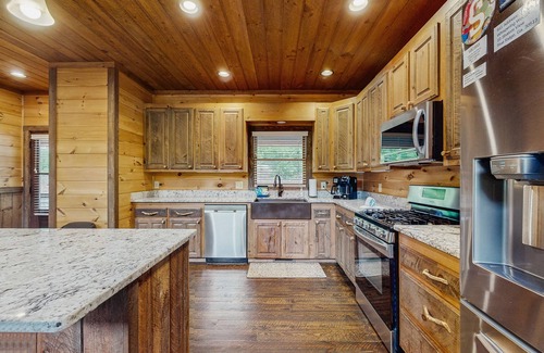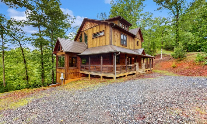 All paved roads lead you to what is sure to be an unforgettable stay in this tranquil gated community in the beautiful North Georgia Mountains! With plenty of room for a large family vacation or group gathering, this exquisite, three-level home is sure to take everyone's breath away. Outside, gather together to enjoy the spectacular view from the furnished deck complete with a 58-inch TV and cook up a meal on the gas grill or just relax on the expansive deck and try to catch glimpses of the deer that visit the property almost every evening. Underneath, pull the cover back and enjoy a soak in your private Sundance Spa hot tub located on the ground level. Inside, warm up around one of three indoor gas fireplaces and settle into the leather couches. The visiting chefs in your party will enjoy the full kitchen with a gas cooktop along with the spacious dining area with plenty of seating. The lower-level living space features a full bar with an additional refrigerator and dishwasher, and there's plenty of fun to be had in the game room with its 60-inch TV, air hockey, and 12-foot shuffleboard table.