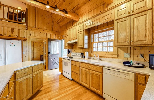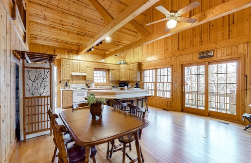 After the day's adventures, unwind at home in a peaceful wooded setting while enjoying contemporary home comforts and modern convenience. The spacious, three-story interior comes well-appointed for family-friendly living. Finished with knotty pine throughout, the main floor boasts cavernous, vaulted ceilings and exposed wood beams, and a central wood-burning fireplace providing a cozy ambiance. Unwind in the living area while streaming shows and movies on the smart TV. The spacious island kitchen has a full suite of major appliances, including a dishwasher, and all the utensils needed for easy home cooking. Chairs can be rearranged between the dining table and breakfast bar for flexible dining options.