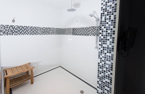 A half bath when first walking into the main level of the house, and a full bathroom on the lower level with a separate soaking tub, and rain shower.