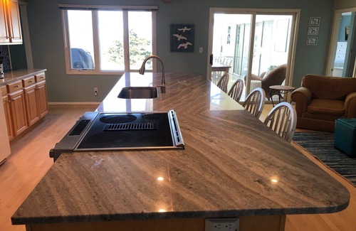 Sleeps 8, perfect for a large family or two smaller ones. You’ll always be comfortable here, with central air (powered by rooftop solar panels), ceiling fans, and lots of screened sliders. The primary bedroom features sliders and a panoramic view of Lake Michigan. The kitchen is well-stocked, with an expansive granite breakfast bar that invites conversation while cooking on the easy glass-top stove/oven. The provided sheets and towels are high-quality. Guests appreciate the "five-star lodging" with "personal touches" throughout. Outside, there's comfortable deck furniture and an outdoor fire pit to enhance the sunset enjoyment. The single-floor living space is ideal for small children and those with mobility issues; those who venture down to the basement will find a cozy game area featuring a pool table and dart board alongside the laundry facilities.