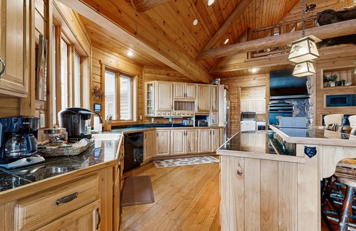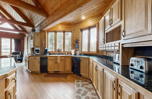 After a full day of recreation, you’ll look forward to retreating to the comfort of one of Otter Cove’s five themed bedrooms that echo the natural beauty surrounding the home. On the main floor, Moose Meadow provides a queen bed and large windows overlooking tranquil views of the woods. Or enjoy the lake view from Deer Haven, a spacious room with a queen bed and double closets. Ascend the log staircase and walk through the French doors into to the enormous, black-bear themed primary suite, which is appointed with a king bed, seating area, balcony, walk-in shower, Jacuzzi tub, and walk-in closet. Two more cozy bedrooms are tucked away on the walk-out lower level for the ultimate in privacy and comfort: Pine Hollow with a flat-screen TV and queen-size bed, and Angler’s Paradise with a flat-screen TV and king bed. An additional bunk room on the main floor provides space for your family to spread out, allowing the kids to have their own accommodations.