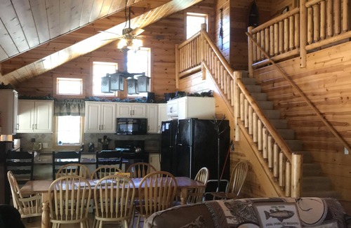 The covered front porch with white Dixie style rocking chairs offers that warm southern greeting as you step through the double set of sliding patio doors into this big, beautiful log home. The open concept living room, dining room and kitchen, with floor-to-ceiling stone gas burning fireplace is the perfect complement to any family gathering or entertaining. There's plenty of seating in the living room for everyone and the new leather ottoman actually opens up into a single bed. Peak in side the closet and you'll find a huge array of games for all ages!