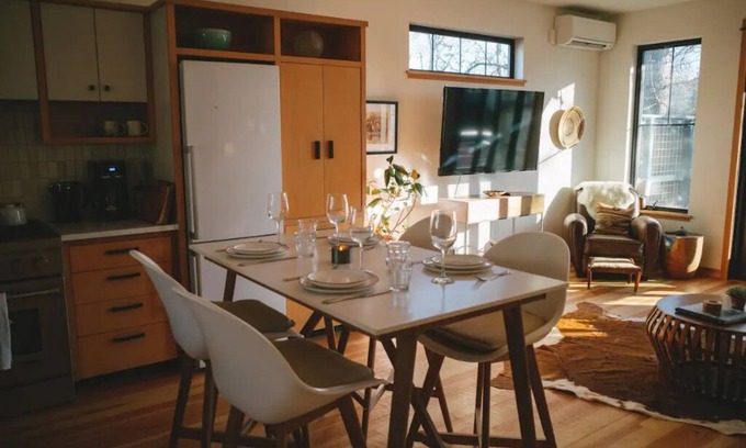This townhome was recently built with so much thought put into it. Every single finishing touch was meticulously curated by the owners who are the craftsmen and designers of the home. You and your friends/family can gather here and create memories indoors in the beautiful space and outdoor on the back patio. You'll enjoy cozy furniture and nice decoration throughout. The downstairs in the living and kitchen is arranged to create an open communal vibe with a sliding door leading to the back outdoor patio that makes for indoor/outdoor living. Relax at home with a fully stocked kitchen, movies on the couch, surfing the web with fast wifi, reading your favorite book, and soaking in the large bathtub. You can take a very short walk (two blocks) into the quaint downtown of White Salmon on Jewett Blvd. where you will find delicious restaurants, a supermarket, White Salmon Bakery (one of the best bakeries in the world), famous Everybody's brewery, library, bars, shopping, and a short drive (3 minutes to the bridge) to explore the charming town of Hood River.