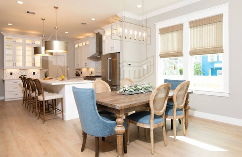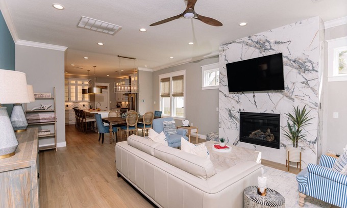 Painted Lady by the Pier will host you in experiencing the best of Galveston Island! This luxury two-story, four-bedroom home is located just 2 blocks off the Seawall with gulf views from the upper patio. Recently featured in Houston's Most Beautiful Homes of 2023 by the Houston Chronicle, Painted Lady by the Pier combines traditional Galveston historic charm with a crisp modern style with all the upgrades! This brand new modern home has all the essentials including central air-conditioning, full home generator for the unplanned storm, WiFi, cable and streaming services, and outdoor dining. Located on the corner lot, parking is plentiful to the front and side of the home with easy access to the back entrance. Inside, the spacious open concept living area is perfect for entertaining and relaxing. The large kitchen is a chef’s dream with an oversized island, high-end appliances, walk-in pantry, gas cooktop, electric oven, drawer microwave, Nespresso coffee maker, large refrigerator and secondary built-in beverage fridge. The cozy living room offers ample seating and a gas fireplace for cold nights. The downstairs is complete with a dining table to gather and share a meal together.