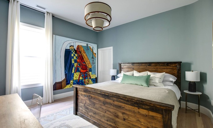 The primary bedroom features a king bed, private bath and dedicated workspace. The back bedroom features two queen beds, a shared bath and deck access. Both rooms have blackout curtains and new pillow top mattresses. The open concept kitchen and living area has large windows and plenty of natural light. Hardwood floors throughout.