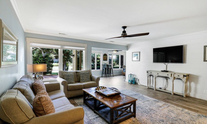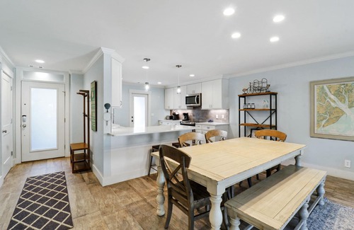 This gorgeous Sea Pines villa has been recently renovated and features golf and lagoon views. Walk into an open-concept kitchen, dining room, and living room. Relax on either of the comfortable couches in the living room and watch your favorite programs on the large flat-screen cable TV, or relax in the Carolina room at the rear of the villa, featuring large windows, perfect for watching golfers tee off on the 10th hole!