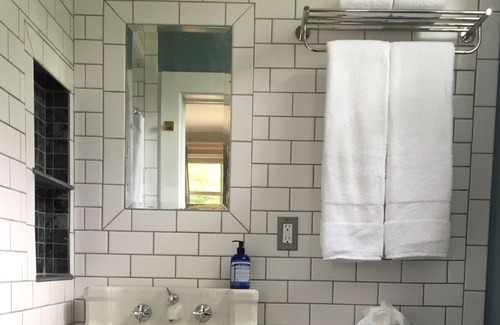 Rising to the 2nd floor you enter the media room with abundant sofa seating and a flat screen with AppleTV. This floor also has a king bedroom, a queen bedroom and another with two twin beds as well as two beautifully restored vintage bathrooms, both with shower and soaking tub.