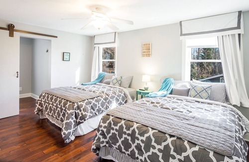 Your dream lake Lanier vacation home, recently renovated, professionally decorated and landscaped. Home features 4 bedrooms / 3.5 bath, lakefront deck and a party dock. Our beautiful modern lake house is ideal for a peaceful, relaxing gathering. Main floor has a large living room, dining table which seats 12, updated kitchen with everything you need to enjoy cooking with your loved ones, master bedroom with 2 queen beds, bathroom and a huge closet, beautiful sunroom overlooking the dock and lake, leading to a two level deck, offering Grill and dining table to enjoy amazing lake views. Second floor offers two large bedrooms: one room has a king bed and the second room has 2 queen beds. Large Bathroom connects two rooms. Day light basement features a spacious living room with a 65" T.V, ping-pong table , forth bedroom offers a queen bed with an updated 3rd bathroom. Our two story dock is there for you to bring your boat (with prior approval), or enjoy swimming, paddling, kayaking on the quiet cove.