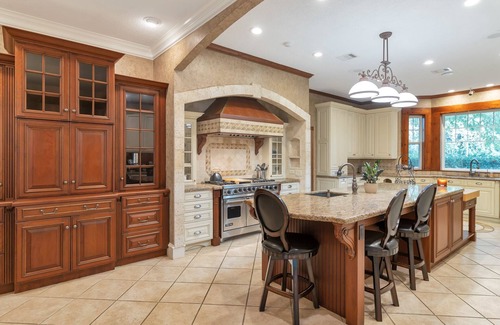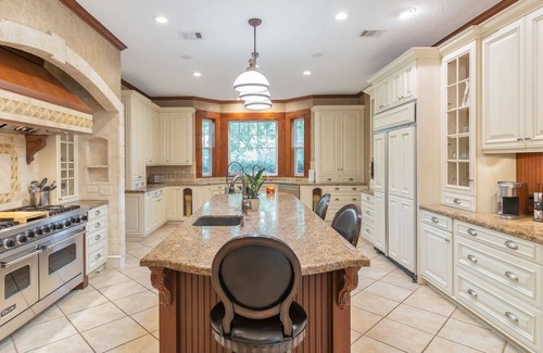 The kitchen is extremely well stocked with double sink for dishes and an island sink for washing vegetables, a dishwasher, microwave, Viking range/oven, Toaster, blender, dishes, pots, pans, crock pot, serving dishes, water glasses, wine glasses, champagne glasses, martini glasses, coffee mugs, serving utensils, casserole dishes, mixing bowls, charcuterie board, cutting boards, and more.