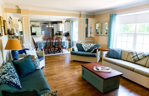 We have a large den with two sofas, a love seat and chair to enjoy the 55" television or Boze wave radio. There is plenty of room to enjoy playing games or putting puzzles together with your loved ones. The living room/ sitting room is set up to enjoy the gorgeous views of the river, reading or enjoying quiet conversations with your family and friends. There is a folding table in the sitting room that can be accessed for additional dining or for putting together puzzles if that's your thing.