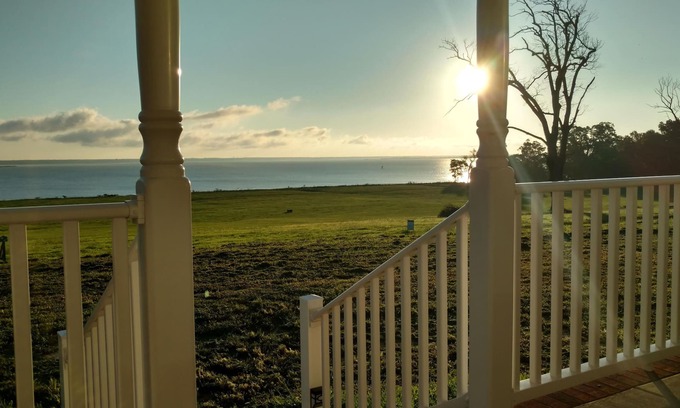 Newly constructed 4 bedroom home with views of the historic James River that will put a new meaning to RELAXATION. Enjoy the views of the historic James River &Jamestown Island. Even the silhouettes of the roller coasters of Busch Gardens which can be seen across the river. In July the fireworks displays from Busch Gardens begin and can be seen from the sitting room or front porch on weekend nights. Hog Island wildlife refuge can be seen across the river too. The sunrises are spectacular and can be enjoyed from the luxury of the three river facing bedrooms, but better enjoyed on the covered front porch with a hot cup of coffee! Or get out early enough to get your "steps" in for a short walk to the beach and enjoy the sound of the waves splashing on the beach as you watch the emerging sunrise. The night views of the river with moon beams bouncing across the water are spectacular and have stopped me in my tracks as I have walked passed windows at night and glanced out. Rain storms and the ever changing sky is just amazing. The sky in itself is a show - not to mention the stars at night.