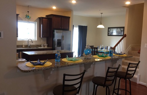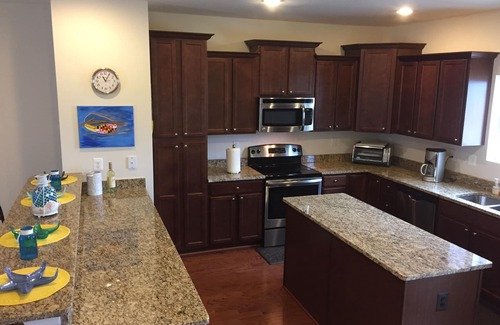 Comfortably sleeps 10 with pull out couch bed. Stunning modern kitchen with stainless steel appliances and granite counter tops; fully stocked with extensive array of cooking and dining ware. Open living/family room with attached kitchen/dining/bar area for friends and family to gather. Large master suite with king-size bed, walk-in closet and luxurious master bath with spacious shower. There are three additional bedrooms and two additional full bathrooms. One of three has a king-size bed and is in the basement. Great for those who can’t navigate stairs. Enjoy large-screen televisions (living/family room and master with smart TVs with apps like Netflix, etc.) with free cable and wifi/internet. There is a 19 inch TV in the downstairs bedroom. Socialize on the furnished outdoor decks. Plenty of parking in the two-car garage with two additional parking spaces in the driveway.