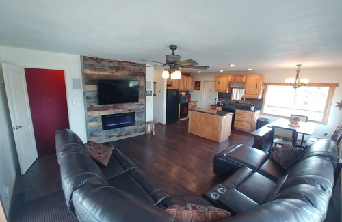 StarView Retreat features four comfortable bedrooms, and two bathrooms. The Master Bedroom has a king size, cool gel technology, mattress. The second upstairs bedroom features a queen bed with memory foam top. There are two additional bedrooms downstairs; one with two full size beds and one with two queens beds. This unique Cabin has been furnished for ultimate comfort. The living room has a comfortable reclining sectional sofa, electric fireplace and flat screen TV. The living room downstairs has a leather sofa, electric fireplace and flat screen TV. The Cabin is perfect for watching movies, and is equipped with two DVD Players and a collection of over 100 DVDs. The kitchen is fully stocked with all the convenience of home, including a dishwasher, oven, glass cooktop, microwave, disposal, and full size refrigerator. Just off the family room enjoy a beautiful, partially covered, wrap around deck with table, chairs, additional seating, and BBQ Grill.