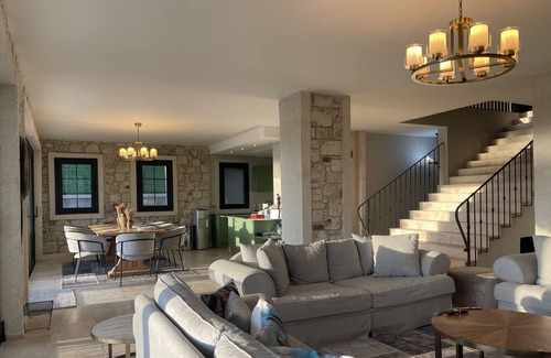 With its 6 bedrooms, bathroom in each bedroom, 12x5 m swimming pool, large and spacious living room, this stone villa offers you an unforgettable vacation. All you have to do in this house, which is furnished to satisfy all your needs from the kitchen to the bedrooms, will enjoy your stay Wireless TV, WIFI and on-site parking are available