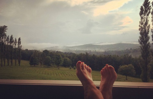 The loft is where my husband and I live when we are not in LA. Although it is still a work in progress, it has the most incredible views of the property. We now have a beautiful 5 burner gas stove-top (in a temporary table), a new oven and dishwasher. Although the cupboards aren’t finished, Dave is designing them now and will start production in 2022. It’s still a great working kitchen with lots of huge tables to work on. The great room is wide open, yet cozy, with a wood stove (and plenty of dry wood). While in Vermont, I paint in the loft and take advantage of the large tables. We recently put shades on the windows to give guests privacy if they want. We choose to let the light in, and watch the weather (something we miss in LA.) There is a large porch off of the great room, with a grill and small table. Enjoy dinner out on the porch, listening to the peepers (or watching fireflies).