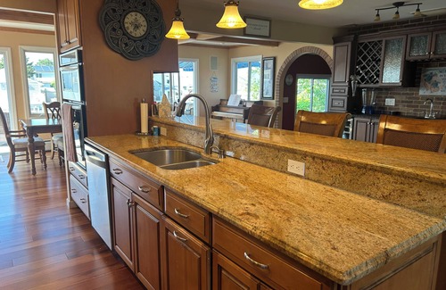The living space is open and airy, with large windows flooding the space with natural light, and just asking you to open the doors to the beautiful lagoon! Open the sliding glass doors to the tremendous deck with gourmet natural gas grill, enjoying the shade of the awning as you sip your lemonade on a summer day. There are also 2 bedrooms downstairs, right next to a full bath. One of them is the Bear bunk bed room that sleeps 5, as well as a great European queen bedroom overlooking the water.