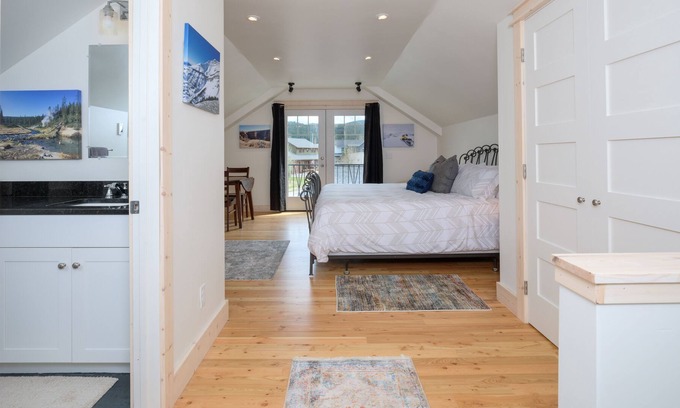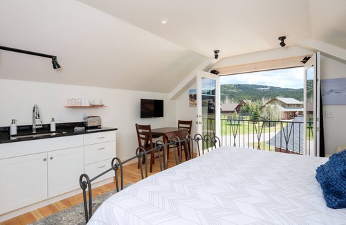 This modern one-bedroom studio has a private entrance, a king-sized bed, a smart TV, ¾ bathroom, and a kitchenette. The kitchenette includes a microwave, medium sized fridge, dining table, and sink. While uncluttered, this studio has the small touches that make for the perfect retreat. French doors allow you to enjoy the view and let the warm summer air in. Simply walk or drive less than a mile to access many of Big Sky`s fabulous restaurants, gyms, retail locations, grocery stores, breweries, coffee shops, local hiking, Nordic skiing, and biking trails, and more all within easy walking distance. This is the perfect location to attend Big Sky’s biggest event of the year, PBR Rodeo, weekly farmer’s markets, and free concerts all summer long. In the winter, this retreat is located ¾ of a mile away from the local ice-skating rink where skating and ice hockey can be enjoyed by all. The brand-new Big Sky Community Center is also within walking distance and has day passes to enjoy rock climbing, full gymnasium, workout facility, fitness and wellness programs, childcare, and meeting spaces. In addition, this location makes it perfect for alpine adventures, wildlife viewing, golfing, white water rafting, fly fishing, exploring Yellowstone National Park, and more Montana escapades. Located 10-minute drive or 18-minute shuttle ride (Skyline Bus stop is located .6 miles away) up to Big Sky Resort for the biggest skiing in America. The west entrance of Yellowstone National Park is located 45 minutes away while following the historic HWY 191 along the Gallatin River.