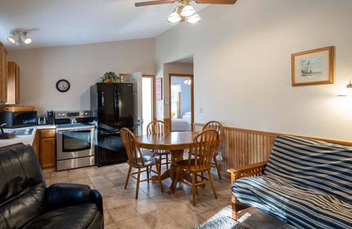 Cottage #21 features two bedrooms and one full bath and one half bath. All main floor, there is a master bedroom with a queen bed and attached 1/2 bath and a second bedroom with two full beds. Living room has a TV, cozy fireplace, and dining space for four. A fully equipped kitchen completes the interior and screened in porch offers additional space to spread out.