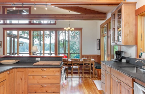 Take in stunning lake views from the large windows in the living room. At-home meals are easy with the fully-equipped kitchen and large dining table, while a tournament-quality ping pong table, Bluetooth music system, and vintage VCR are ready to entertain.