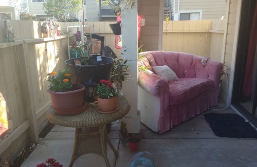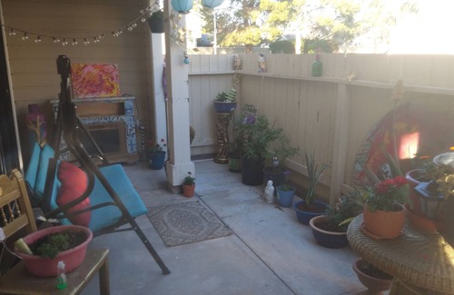 I am an artist so my art reflects my home it's a 1 bedroom with one bathroom full dining room kitchen and patio it has two TVs smart one in the bedroom and one in the living room very roomy clean you could use the kitchen and all the utensils the patio has a lot of plants and flowers to enjoy while you sit on the swing or the soft chair lighting to set the mood