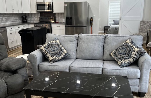 Living room: Sleeper sofas | Linens | Hulu Live Smart TV | Board games | Bar seating for 4
