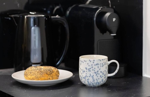 Induction hob, electric kettle, fridge-freezer, dishwasher, coffee machine (capsule), microwave, table with 2 chairs, kitchen utensils, tableware