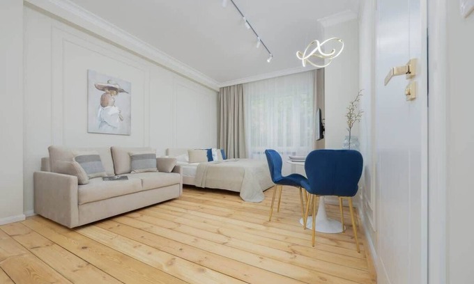The comfortable 27 m² studio apartment has the capacity to accommodate 4 people. It consists of a seating area with a kitchenette and a bathroom with a shower. The interior of the studio has been decorated in elegant pastel colours, in addition, carefully selected gold accents emphasise the sophisticated character of the space. The lounge area features a large double bed and a sofa bed, providing a variety of sleeping options for guests. As an additional form of entertainment, guests can easily find their favourite programme or movie while savouring a moment of entertainment in a comfortable environment with access to Smart TV and cable TV functions. The kitchenette is equipped with essential kitchen appliances and accessories, such as an induction hob, fridge-freezer and microwave, so Guests have the opportunity to explore the art of cooking, enjoying complete independence and comfort during their stay. The bathroom is not only a place of relaxation thanks to the shower available in it, which provides the opportunity to unwind, but also making life easier is the washing machine together with the dryer, which make the guests' stay even more comfortable. A complimentary toiletries, towels and bed linen are provided for a good start to each arrival.