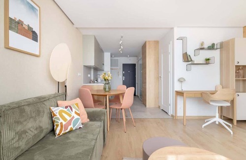 This 37 m² modern apartement is ideal for a business trip, a weekend getaway or a family stay. It consists of a living room with kitchenette, a comfortable bedroom, a bathroom and a balcony. The main air-conditioned room includes a comfortable sofa bed, a TV for entertainment, a table with four seats for sharing meals and a desk ideal for remote working. The kitchenette is well-equipped with an oven, induction hob and microwave for preparing home-cooked meals. The bedroom offers a comfortable double bed, making the apartement ideal for 4 people. The bright, compact bathroom includes a shower and toilet. In addition, there is a washing machine in the hallway, useful for longer stays. This friendly and comfortable flat is sure to meet the expectations of even the most demanding guests. For a good start to their stay, we provide guests with free toiletries, towels and bed linen.