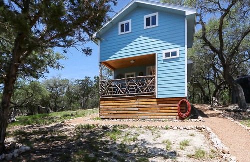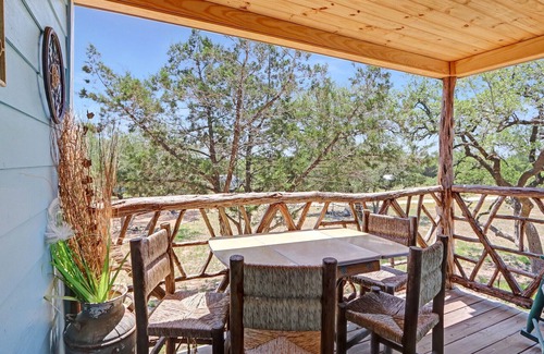 The adorable kitchenette provides a minifridge, microwave, toaster, and just enough kitchenware to prepare simple meals. On the welcoming front deck consisting of a dining room set, feast al fresco under the stars or, using the coffee maker, delight in a savory caffeine boost while enjoying your morning coffee basking in the hill county landscapes.