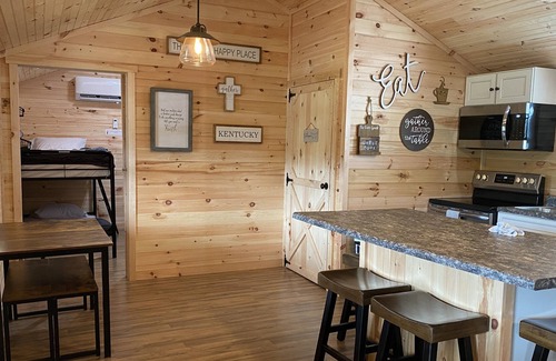 Located about 20 minutes from the Ark Encounter, you'll love staying in our Charis Cabin. INSIDE enjoy around 760 sq ft of space with 2 bedrooms, full kitchen, full bath and a washer/dryer. OUTSIDE the fun just keeps going with 84 acres filled with hiking trails, a stocked fishing lake, a fire pit & outdoor area with a charcoal grill and a covered porch with beautiful sunsets. Star Link Internet available. NO TV. Enjoy an unplugged getaway!