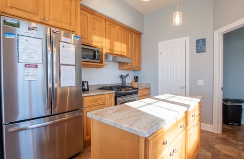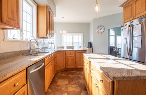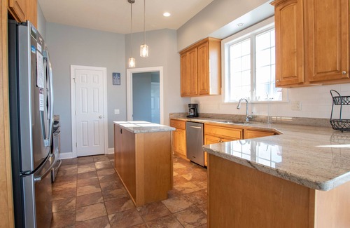 Just around the corner, you'll find an open kitchen is accented with custom cabinetry and granite counter tops. Challenge the chef of your group to a cook-off and create vacation memories to last a lifetime while at Gracie's Place. An eat-in kitchen table allows you to enjoy mingling with the chefs, or break out a deck of cards and play a game while meals are being prepped. We recommend you don't forget the wine!
