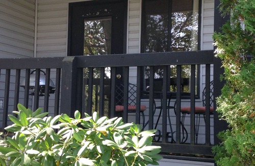 An HDTV with DVD player and wood fireplace are in the living/full kitchen area. A small deck looks out to the outdoor swimming pool and tennis/basketball court. A community indoor swimming pool and hot tub are also close and accessible to guests.