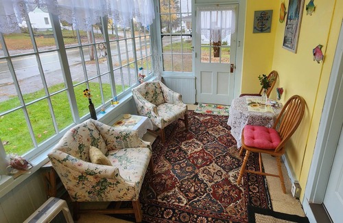 The bright and sunny sun porch is the perfect place to have your morning coffee and people-watch, equipped with an electric space-heater for those chilly winter mornings.