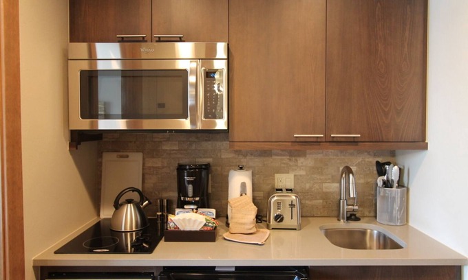 Suite residence with full bath and kitchenette. Bedroom with king bed and additional sofa bed. Resort amenities include indoor/outdoor pools, hot tubs, spa, movie theater, grotto, game room, and Robbie's Tavern restaurant.