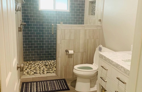 Down the carpeted stairs, you walk into the 'bunk' room. There is a hallway that leads to the shared bathroom, laundry room and 2 other guest rooms.