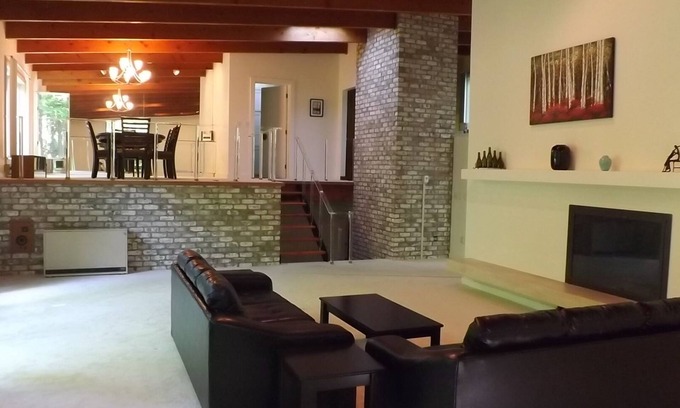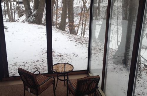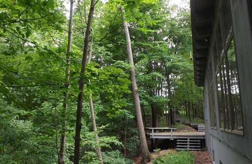 The house has three levels and has a open spacious floor plan. The kitchen has all modern conveniences including GE Profile Stainless Steel appliances and granite counter tops. There is Wi-Fi .The laundry room features front loading washer/dryer. Dining room has a large table and seating for eight. The mid level bedrooms (one queen bed, one full) each have a full bath. The half bath is in the laundry room, off the kitchen. The bottom level is a huge room with a walk out and fireplace and a queen bed. The back of the house features a 'glass room' with a futon that could sleep one or two more people. There are three full size couches that could easily sleep three more. It is a long walk to the door down a deck. It is NOT steep, but there aren't handrails until the bottom section. We recommend to bring your own drinking water as this home is on a well/septic system.