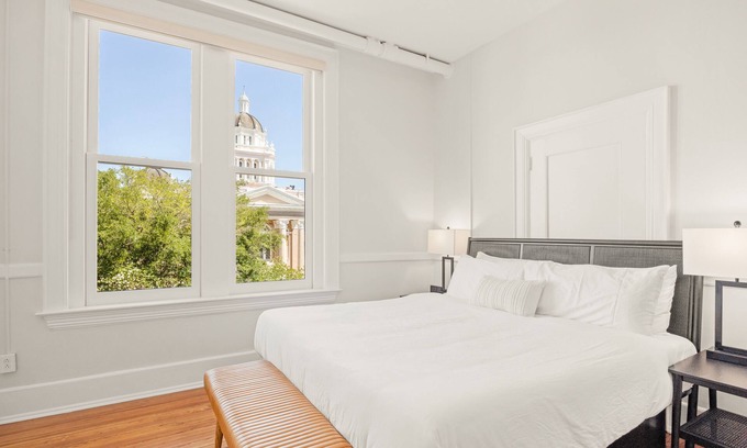 Located on the third floor of our historic boutique hotel, Grand Tour, has a king size bed and a wonderful view of Central Avenue and the newly renovated Lowndes County Historic Courthouse. The Mckey is centrally located in Downtown Valdosta in the heart of all their is to do. There are many great restaurants and things to do within walking distance.