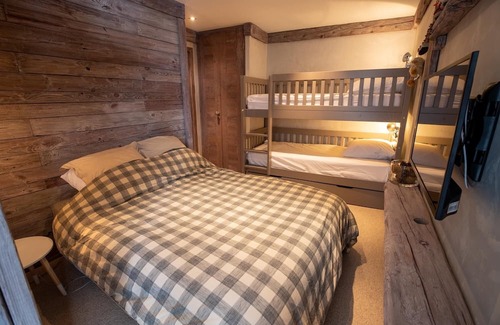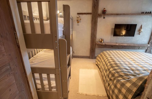 The bedroom has a double bed (140cm), a bunk bed, and a corner desk with a fabulous mountain view. The apartment can accommodate a maximum of four people. If you don't all want to be in the bedroom, it's possible to use the convertible sofa in the living room (140x190).