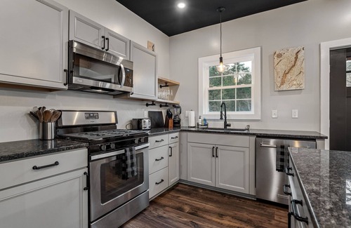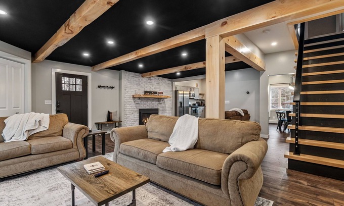 Graphite MTN Retreat is located .75 mi from the Hague Beach/Boat Launch on Lake George and 20 mi from Lake George Vil. Fully renovated, this home has industrial style finishes to pay tribute to the towns 1900s graphite mining boom. With modern amenities, fireplace, smart TV, and A/C you will find everything you need here. Outside, there is off-street parking with a level II EV charger, back deck, gas grill, outdoor dining, fire pit with ADK chairs, and the Hague Brook right in the backyard.