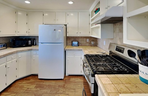 The large living area boasts vaulted ceilings, a flat-screen TV with a selection of DVD movies, plush seating, a classic cast-iron wood burning stove, access to the front deck, and soaring picture windows. The far side of the room features a dining area with a large table and eight leather, swivel chairs. This area opens into the kitchen, which features plenty of counter space, ample cooking equipment, and a breakfast bar with three stools.