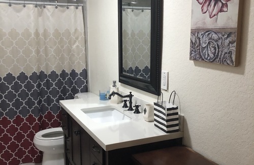 The bathroom boasts a shower stall with marble floor and marble vanity, lighting treatments, luxurious hotel size towels and fresh linens. SUPER CLEAN and bright!