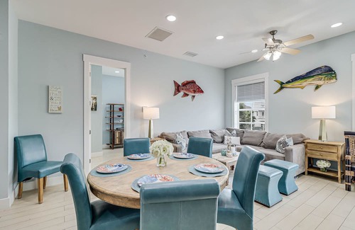 MAIN LIVING SPACE: A large sectional sofa facing a wall-mounted TV anchors the main living area, which flows back to the dining area and kitchen. A round table seats up to six, and there’s bar-stool seating at the kitchen island. Stainless appliances and every gadget you’ll need make meal prep easy, and the kitchen offers bonus storage and built-in nooks for beach gear during your stay.