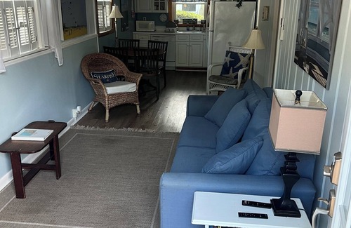 Fabulous cottage just four houses from the beach on Swedes Street! Light and bright with coastal decor. Brand new vinyl flooring throughout , freshly painted, updated furniture. Newly installed paver private patio with seating for four. One queen bed in master and twin bunk beds and a single twin in second bedroom. Renovated bathroom. New central air conditioning.