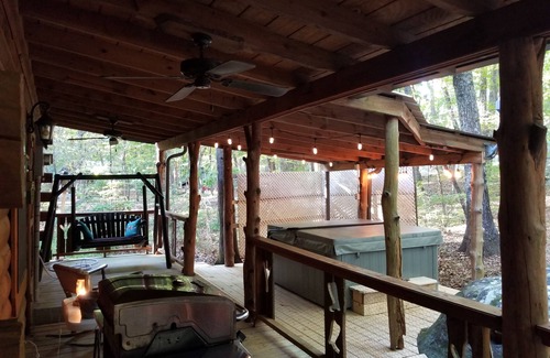 "Great Are The Simple Things In Life" No Doubt you will experience this in our Brand New Cabin. You'll find that "Rooks Nook" features many personal touches, from the high-end antique distressed cabinets and furniture. "Rooks Nook" is a spacious 1500 sq. ft. log cabin, where the exposed beams and rustic wavy board siding were cut from pine trees cleared from the lot. The wrap around porch is inviting, with two wooden log swings and rocking chairs, with a black distressed finish. Also features a hot tub deck.