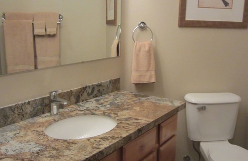 The guest bathroom has been remodeled and has a tile floor and granite counter.