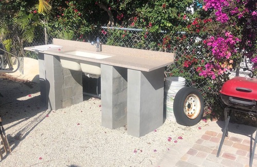 There is an outdoor shower and fish cutting /cleaning station, barbecue.