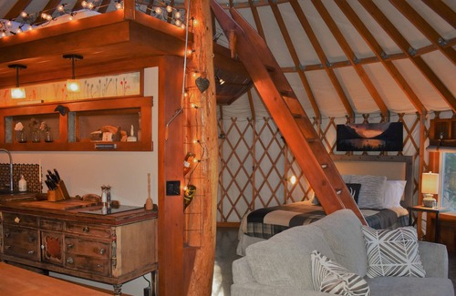 This is THE yurt! While she is small, she is mighty. Open the door to the main floor: living, dining, kitchen, queen size bed and surprisingly roomy bathroom. Drop the ladder down and head up to the loft area with a full size bed. All the furnishing is new and completely comfortable, with the exception of the "upcycled" kitchen cabinets. The home stays toasty warm the radiant floor heat. Use the wood burning stove for an extra kick of ambiance and heat.